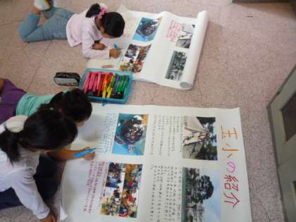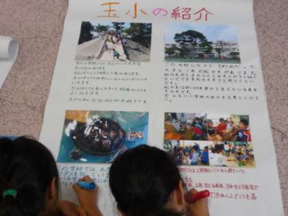4年生の前期の代表委員の人たちが、11日に行われる3校合同避難訓練の後の学校紹介のために、中町小と玉川中に学校の紹介ポスターを作成しています。玉小の大きな松と力山とアオウミガメのことを紹介しています。放課後の時間を使っての作業ですが、丁寧に作り上げていて、当日の発表が楽しみです。