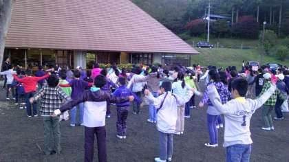 すばらしい青空に迎えられて、食堂前の広場で朝会を行いました。全員元気に一人の病人もなくラジオ体操まで行いました。このあと川場での初めての朝食です。
