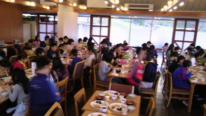 朝会の時からお腹すいたという子もいるほど、元気な5年生。食事係の準備も無事に終了し、生活班ごとに固まって食事しました。ほとんどの子が完食です。次は、いよいよ山登りです。