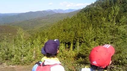雨乞い山登山が始まりました。林のトンネルをくぐったり、急坂を上ったり、悪戦苦闘しながら、全員が山頂にアタックしました。天候は最高で、登山にぴったり。