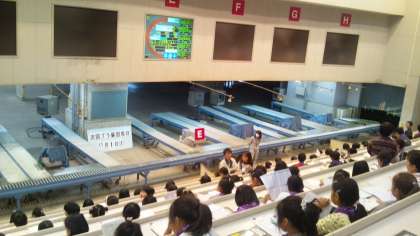 用賀にある世田谷市場に到着しました。世田谷市場では、野菜や花の競りについて市場の人に説明を聞きました。本当の競りを行う場所で、ためになる話をしっかり聞きました。