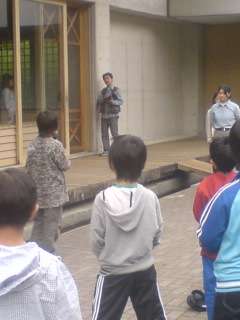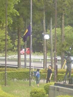 お世話になったふじやまビレッジともいよいよお別れの時がやって来ました。閉室式が終わり校旗がおろされました。これから村めぐりです。