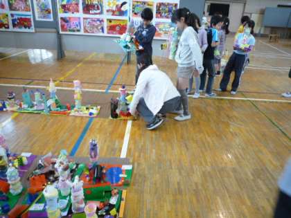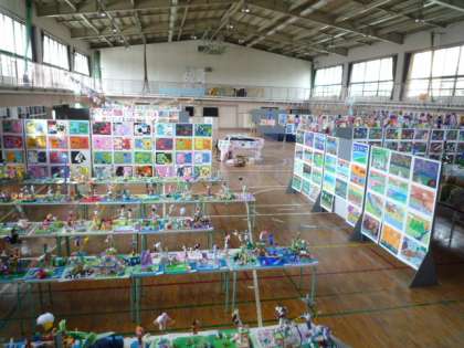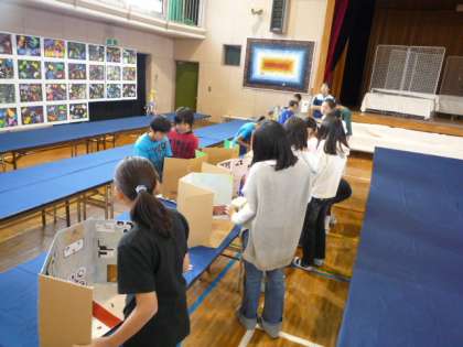 昨日の6時間目を使って、6年生が会場づくりの手伝いとして、パネルやいす、長机などを一生懸命体育館に運んでくれたおかげで、今日は朝からいろいろな学年が作品を体育館に展示することができました。明後日まで、作品展示に時間がかかりますが、体育館が少しずつ美術館のようになってきています。当日をお楽しみに。