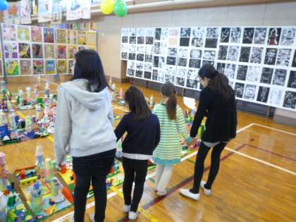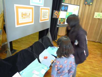 いよいよ今日から、展覧会が始まりました。1,2時間目は、1年生と6年生がペアになって、いっしょに作品の鑑賞を行っていました。6年生が1年生に「あれは何?」と尋ねられて、丁寧に説明している姿も随所に見られました。作品一つ一つが、個性にあふれていて、元気な明るい玉川小の子どもたちが伝わってきます。