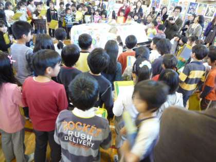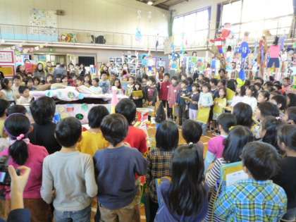 12時過ぎたころ、会場の体育館の中央から、さわやかなピアノの音が聞こえてきました。すると、見学していた3年生がピアノの前に集まり、「玉川小学校138周年おめでとう!」の大合唱から、ピアノに合わせてすてきな曲を2曲披露してくれました。とたんに会場が本当の美術館に変身したかのように感じました。参観していた保護者からたくさんの拍手が沸き起こりました。