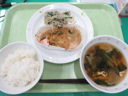 有機米・さけのちゃんちゃん焼き・もやしのゴマ風味・五目汁・牛乳