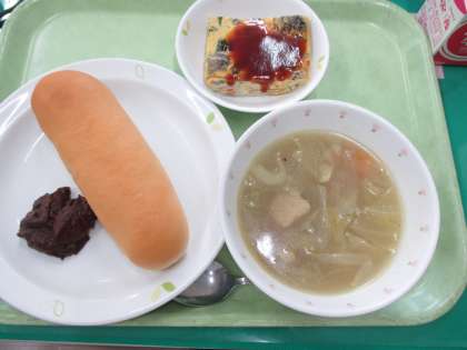 パン・スペイン風オムレツ・野菜スープ・ココアクリーム・牛乳