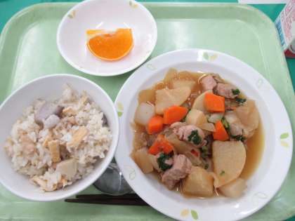 里芋ごはん・豚肉と大蔵大根の煮物・オレンジ・牛乳