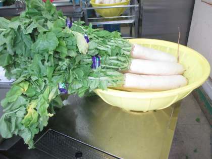 加藤さんの畑の立派な大蔵大根の葉っぱを使って