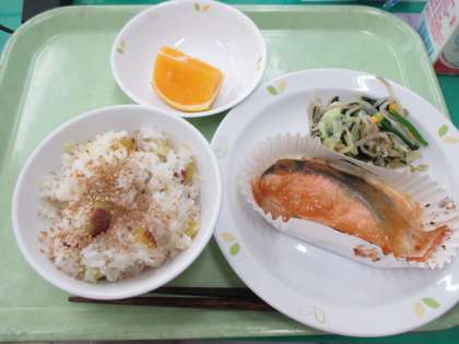 さつまいもごはん・さけのみそマヨネーズやき・いそあえ・ネーブル・牛乳