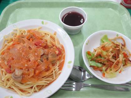 トマトクリームスパゲティ・じゃがいものハニーサラダ・ぶどうゼリー・牛乳