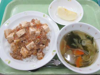 マーボー豆腐丼・わかめスープ・りんご・牛乳