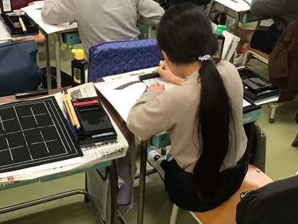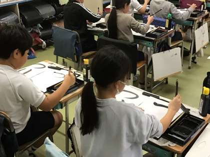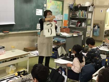 書き初めに続いて、今日は「つり」を書きました。“海“で筆を馴染ませて、“陸“へ上がる坂道で筆を整えます。