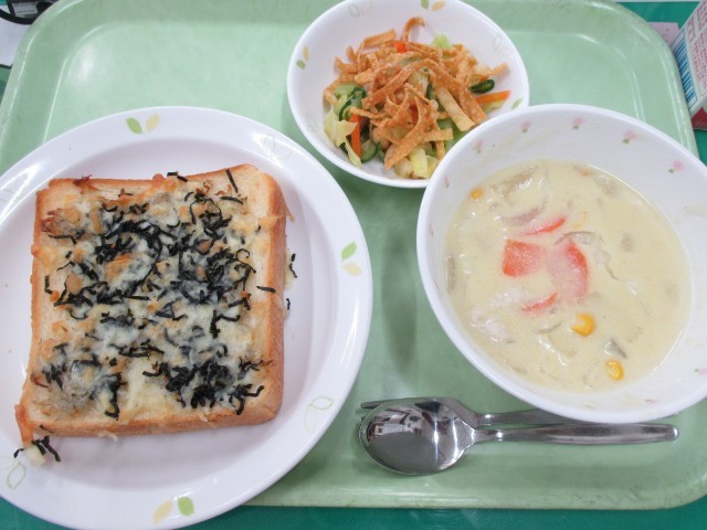 じゃこマヨトースト・コーンクリームスープ・カリカリ豆のサラダ・牛乳