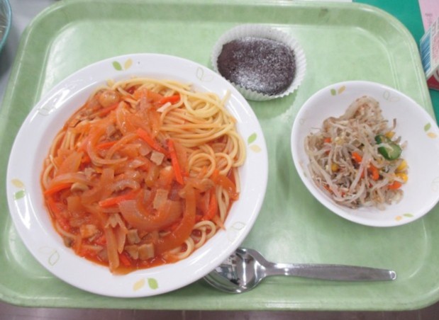 トマトパスタ・じゃこ入りサラダ・ガトーショコラ・牛乳