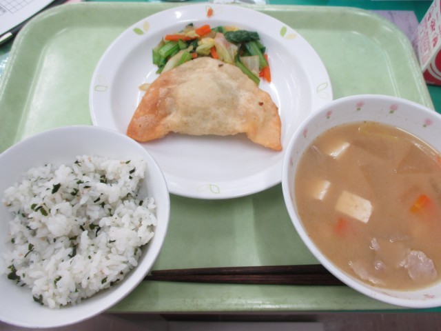 わかめごはん・豚肉とねぎのぎょうざ・おかかあえ・どさんこじる・牛乳