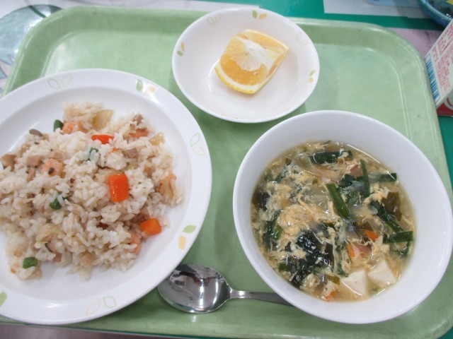 きのこチャーハン・にら玉スープ・オレンジ・牛乳