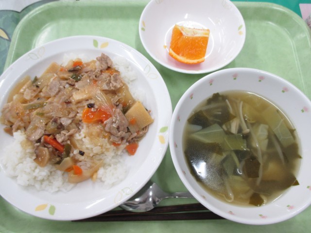 スタミナ丼・ながねぎとえのきの中華スープ・オレンジ・牛乳
