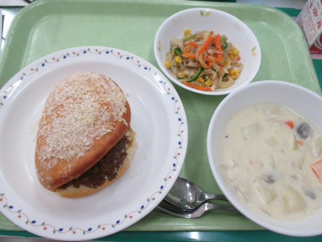 焼きカレーパン・クリームシチュー・大根サラダ・牛乳