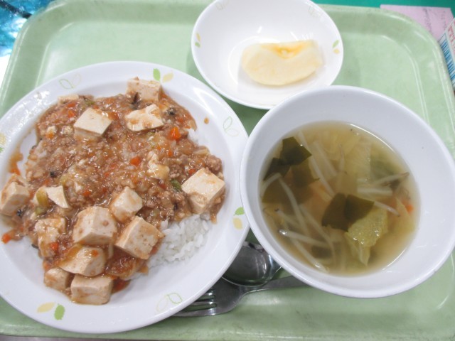 マーボー豆腐丼・わかめスープ・りんご・牛乳