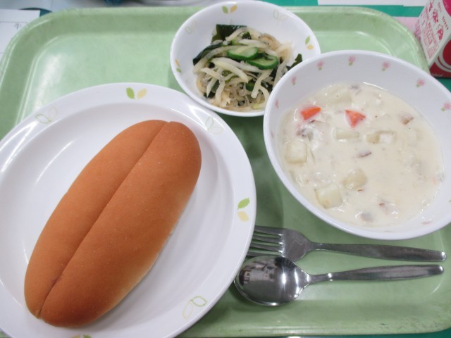 きなこパン・サーモンシチュー・じゃこサラダ・牛乳