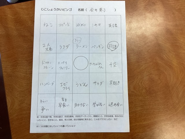 クラス中のお仕事分担や係などを決めました。ビンゴを使って自己紹介をする場面もありました。自分だったらカードにどんな言葉を入れますか?