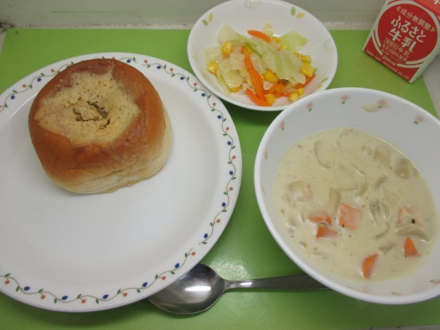 ビスキュイパン・牛乳・サーモンシチュー・コーンサラダ