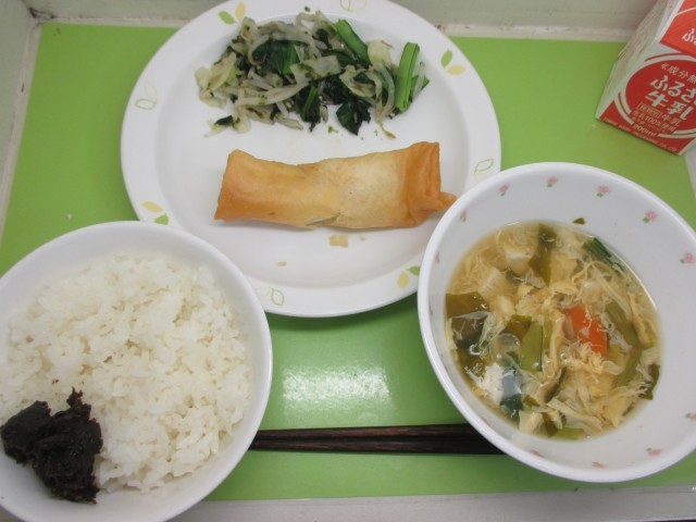 有機米ごはん・牛乳・彩り野菜の春巻き・磯和え・かきたま汁・のりの佃煮