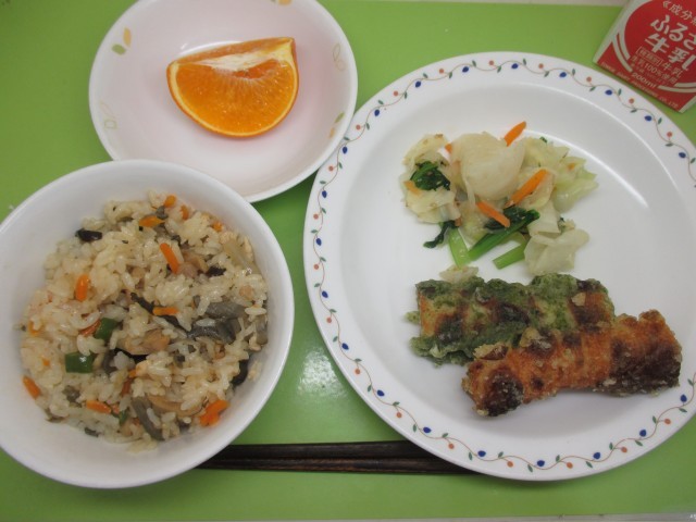 とりめし・牛乳・竹輪の二色揚げ・きゃべつのあっさりあえ・セミノールオレンジ