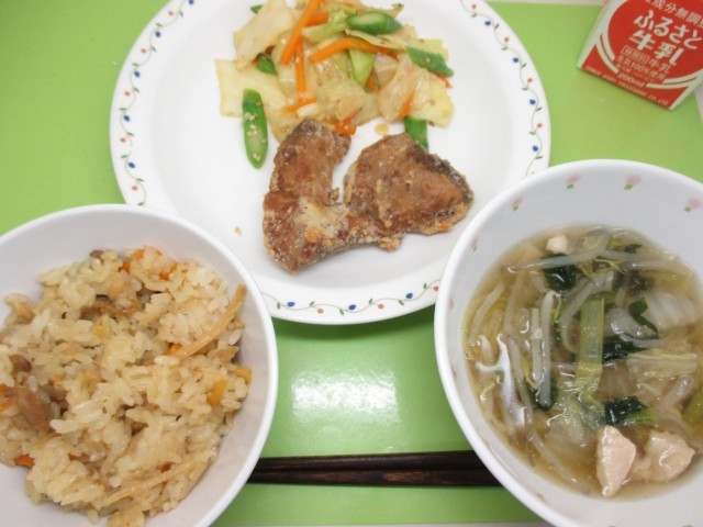 中華おこわ・牛乳・魚のたつた揚げ(鰹)・春野菜サラダ・中華スープ