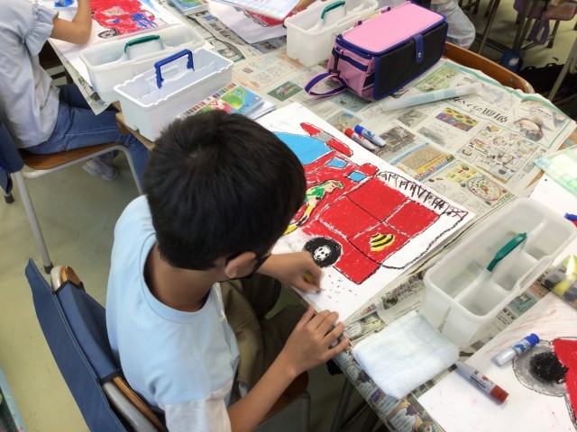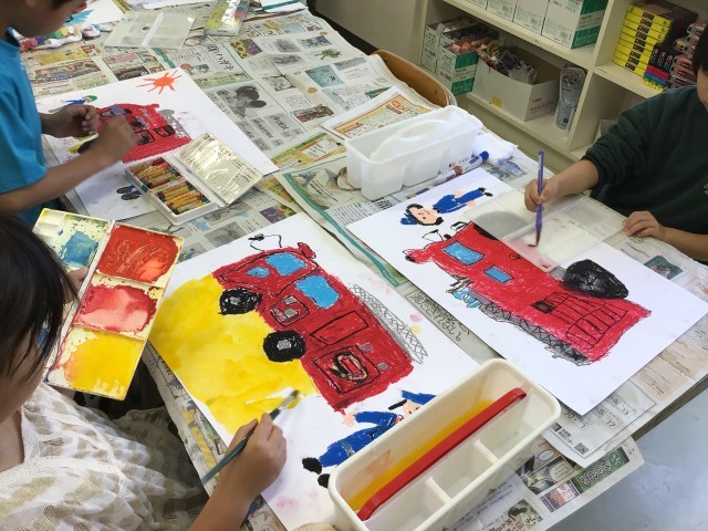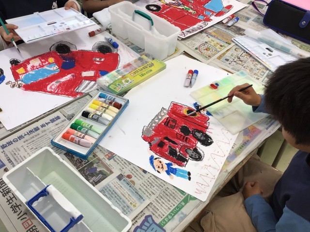 先日の消防写生会で描いた絵に絵の具を使って色をつけました。そろそろ完成です。