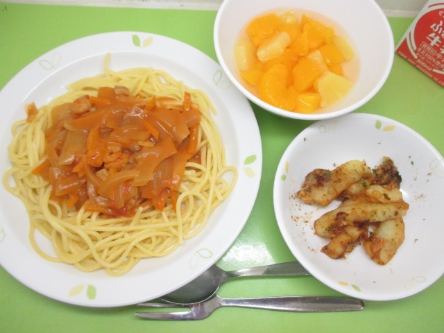 スパゲティイタリアーノ・お好みポテト・フルーツポンチ