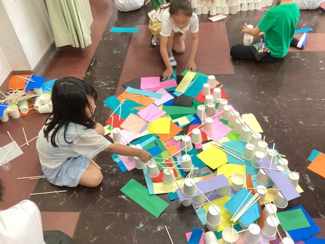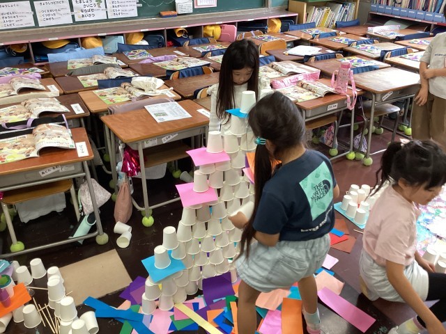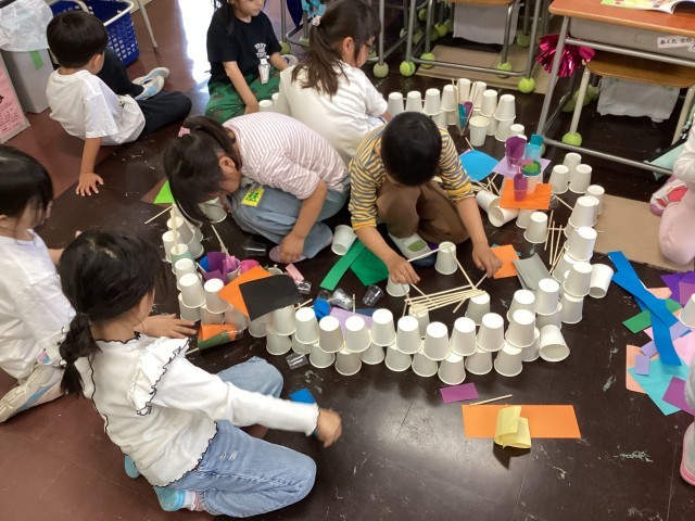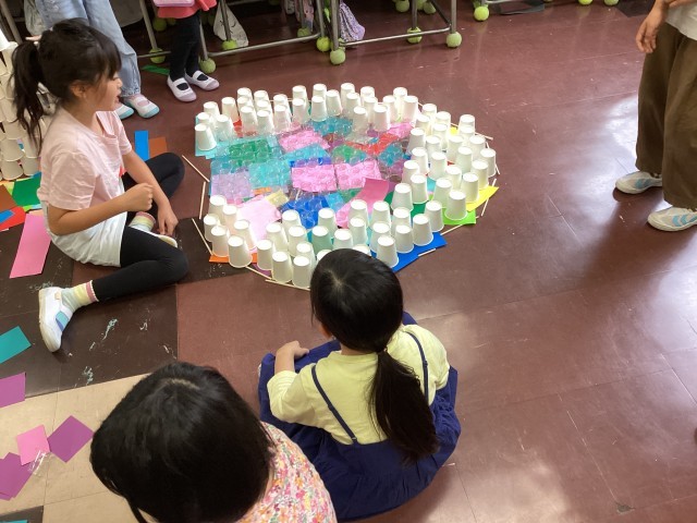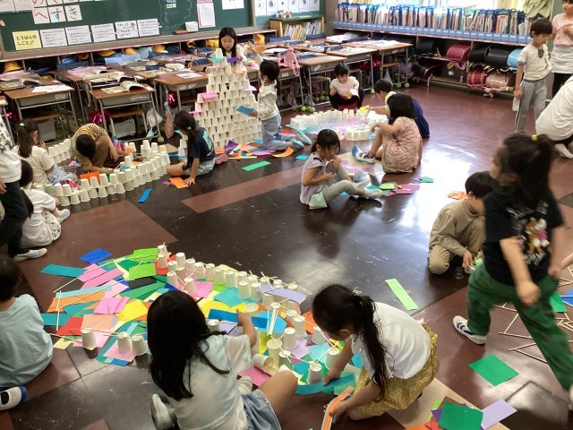 1年生の図工の授業です。つなげて、ならべて即興的に作品を作る学習です。子どもたちのダイナミックさに改めて感心しました。