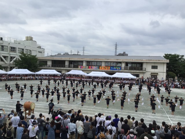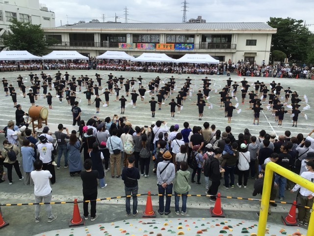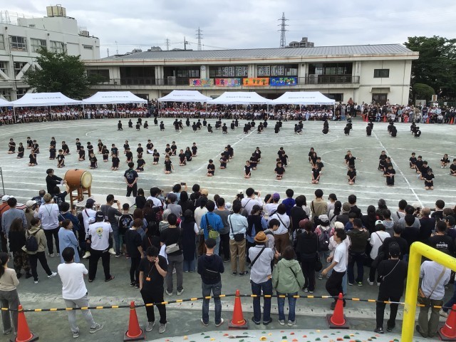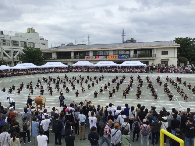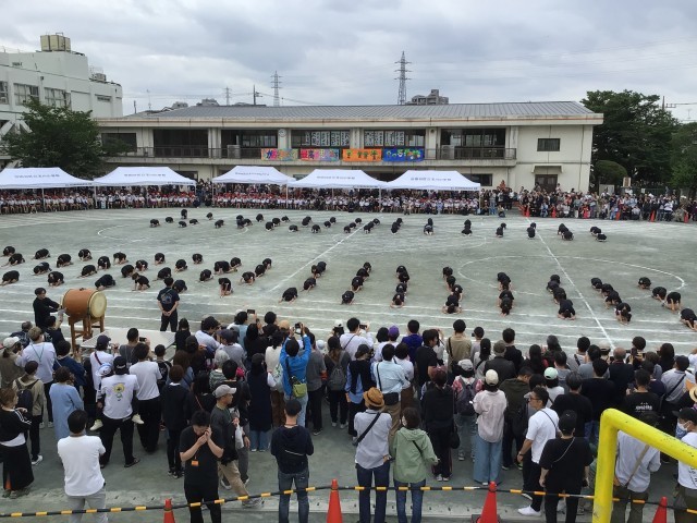 日本の伝統「御神楽」は大太鼓に合わせて踊ります。演じた後も折目正しい挨拶で締めくくりました。