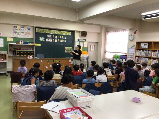 学校公開2日目です。読み聞かせが始まると子どもたちの話し声がピタッと止み、食い入るよに絵本を見ます。情感豊かな語りは、目をつぶっていてもお話の場面が思い浮かぶようでした。