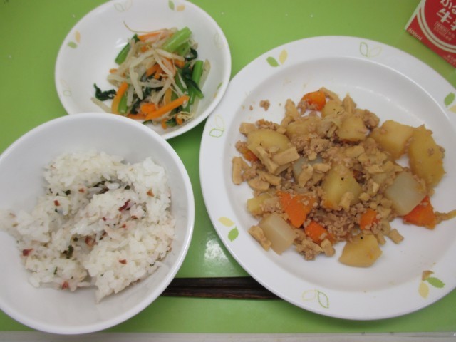 梅わかごはん・牛乳・じゃがいものそぼろ煮・しらすとこまつなのあえもの