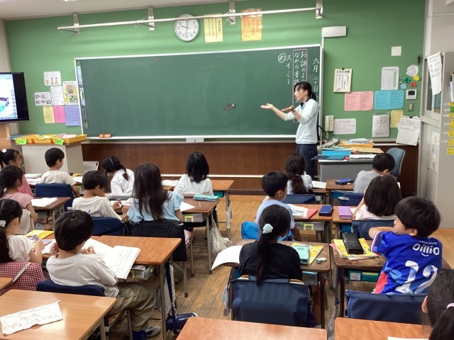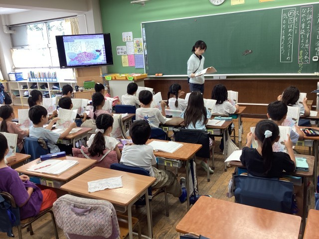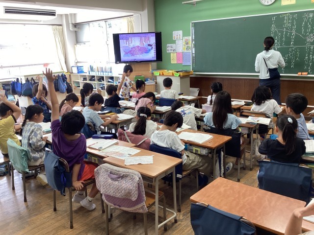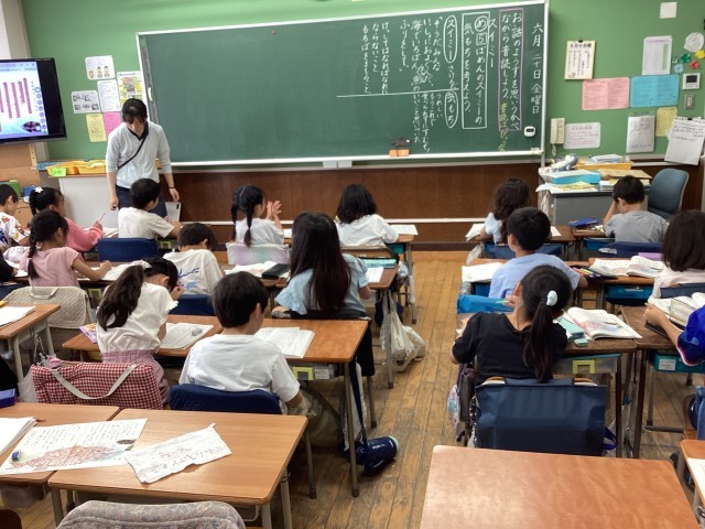 国語の学習です。主人公のスイミーの気持ちを文章から読み取りました。教科書の書き込みにも挑戦しました。
