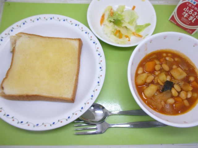 はちみつレモントースト・牛乳・ズッキーニ入りポークビーンズ・アスパラガスのサラダ