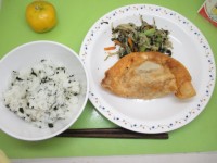 わかめごはん・牛乳・ジャンボぎょうざ・野菜ののりあえ・くだもの(みかん)