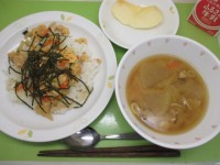 鮭ごはん・牛乳・芋煮汁・もやしのごまあえ・くだもの(はれひめ)