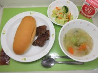 コッペパン・いちごジャム・牛乳・くじらの竜田揚げ・キャベツのサラダ・野菜スープ