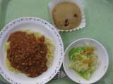 スパゲティミートソース・きゃべつのサラダ・黒糖蒸しパン・牛乳 主な食材と産...