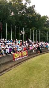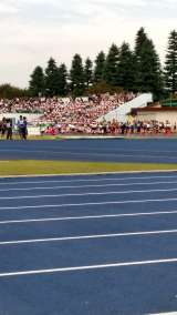 女子の競技中です。 玉川の応援席からは、ハードルのゴールと高跳び、100メート...