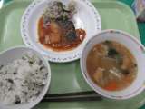 かむかむわかめごはん・さばのみそ煮・きゃべつのゆかりかけ・もちもちスープ・牛乳...