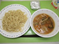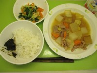 麦ごはん・牛乳・豚肉と大根のうま煮・野菜のからししょうゆかけ・のりの佃煮