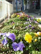 校庭と職員室の間の花壇に、10月ごろに3年生が植えたパンジーが見事に咲きそろって...