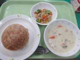 黒砂糖パン・豆腐ナゲット・コーンポテト・お野菜たっぷりスープ・牛乳 主な食...