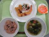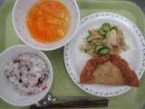 赤飯 牛乳 ミックスフライ 大根とわかめの甘酢かけ すまし汁 オレンジシャーベッ...