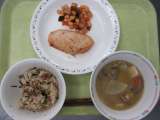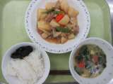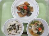 鯛ごはん 牛乳 筑前煮 豆腐汁 具だくさんの煮物が出来ました。 焼いた鯛を入れ...