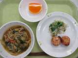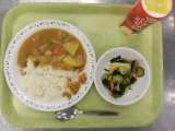 カレーライス 福神漬 りんごジュース 海藻サラダ 今日は交流給食です。今までお...